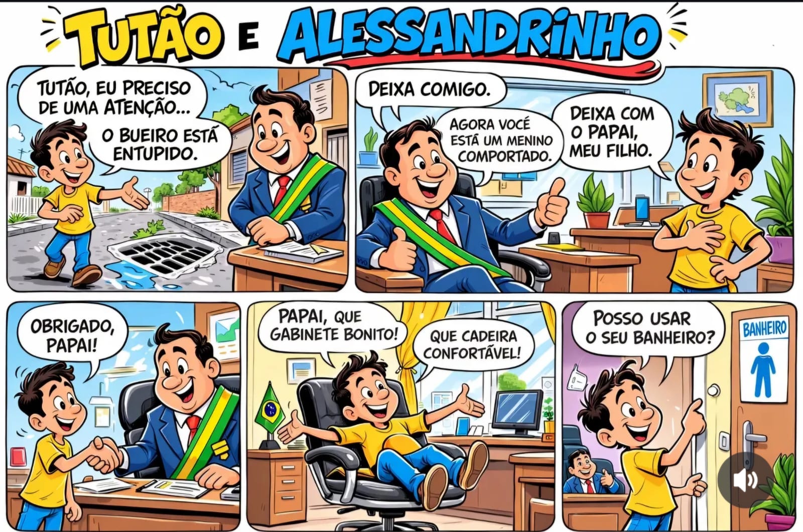 Na narrativa, o personagem “Alessandrinho” aparece como um menino que procura o prefeito para relatar problemas urbanos, como um bueiro entupido. O prefeito, identificado como “Tutão”, responde de forma paternalista e convida o garoto a conhecer seu gabinete. A sequência sugere uma relação de proximidade e alinhamento político entre os dois.